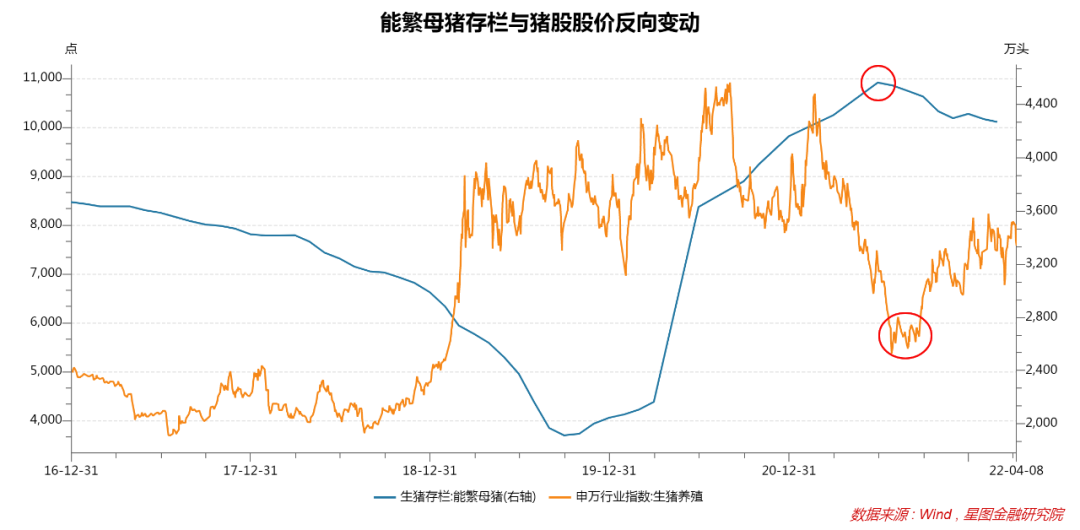 第一层逻辑,当能繁母猪处于高位时,意味着10个月之后的生猪供给处于高位,届时生猪价格大跌,生猪养殖企业步入深度亏损期,预见到这一点,聪明资金会提前离场,在这个角度,能繁母猪的高点应该对应生猪养殖企业的股价高点。