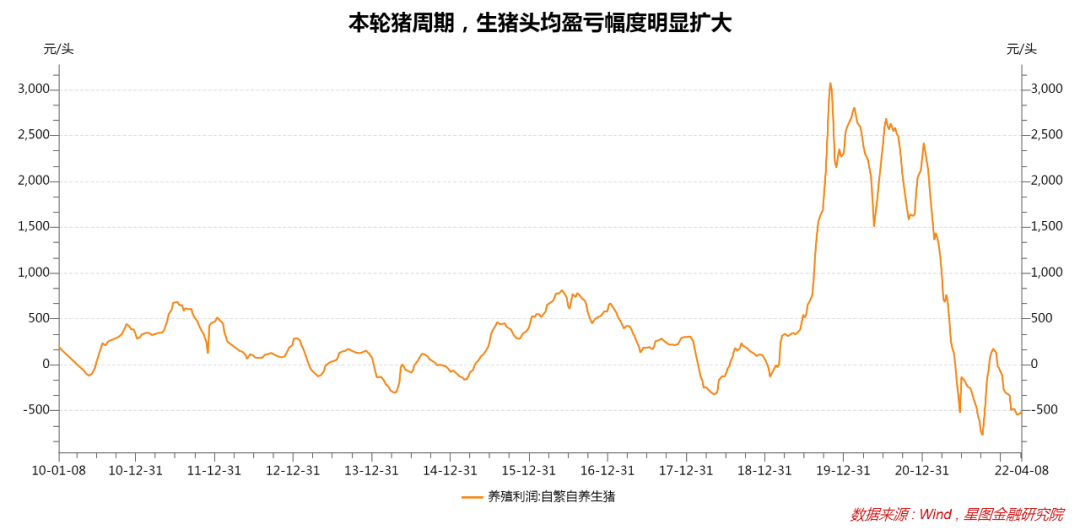 2022开年以来,A股生猪养殖板块走出了一波独立行情。截止4月11日,申万生猪养殖指数累计上涨6.8%,跑赢沪深300指数近27个百分点。但与此同时,生猪养殖板块仍处于深度亏损阶段,当前育肥猪头均亏损约500-600元,且从猪价走势看,市场普遍预计今年下半年猪价才有望迎来反转,巨额亏损还要维持一段时间。