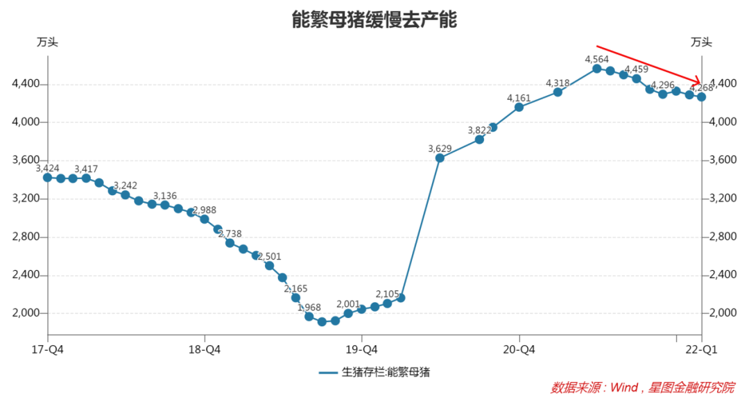 就本轮能繁母猪产能去化进度来看,截止2022年2月末,我国能繁母猪存栏量4268万头,较本轮周期高点下降6.49%。