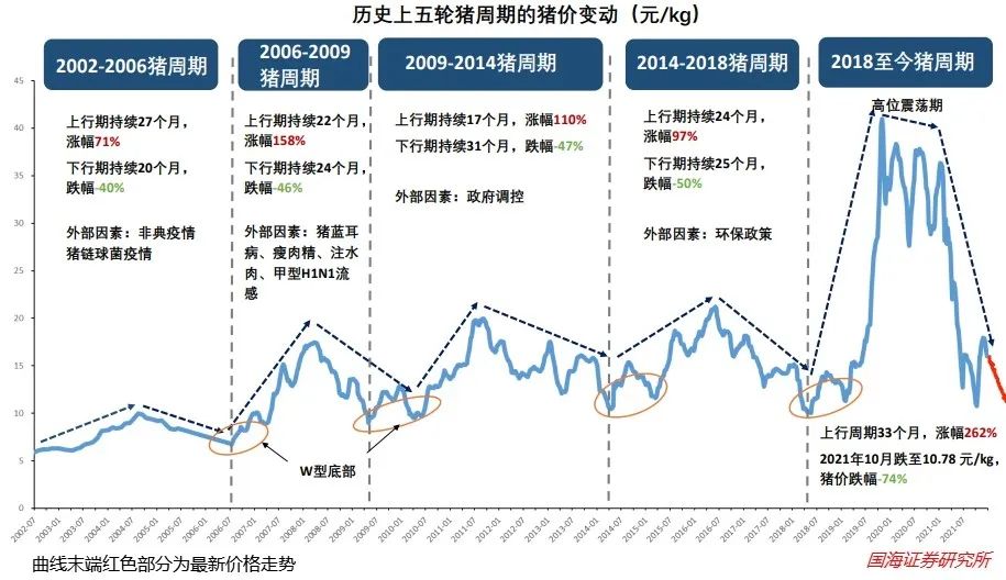 据统计,2002年至今我国共发生了5轮猪周期,平均3-4年轮回一次。本轮猪周期从2018年6月生猪价格触底回升开始,一直持续到2019年11月,最高单周平均猪价达到40.9元/kg,受非洲猪瘟扰动,猪价高位震荡了13个月,2021年1月猪价步入下行周期,至今最低单周均价跌至10.78元/kg。