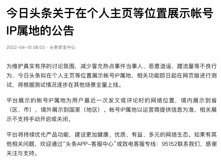 4月15日,头条安全中心发布公告称,为维护真实有序的讨论氛围,减少冒充热点事件当事人、恶意造谣、蹭流量等不良行为,今日头条拟在个人主页等位置展示帐号IP属地,相关功能即日起在网页版进行测试,将根据测试情况逐步在其他场景全量上线。