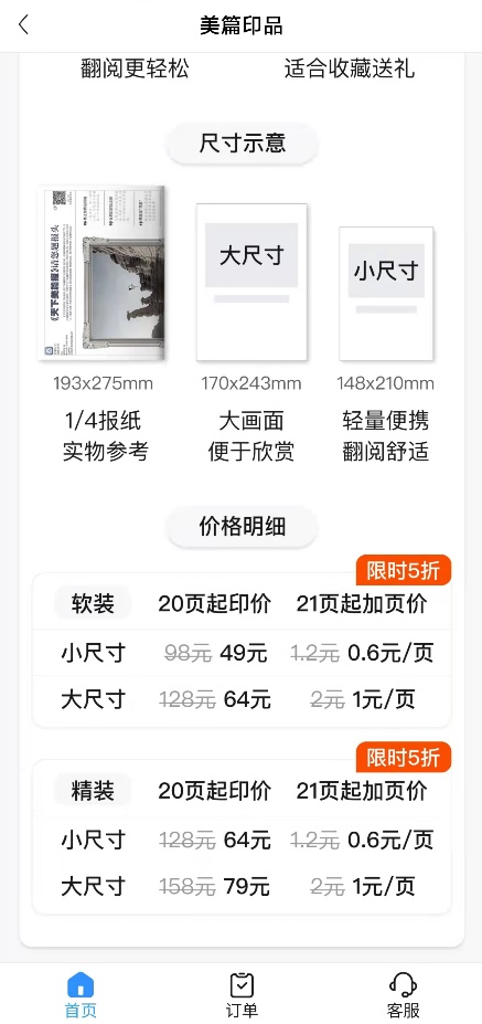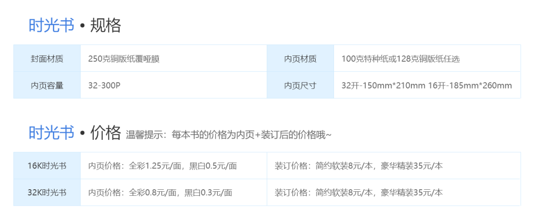 专门做回忆录的平台以“时光流影”为例,专注于老年人的平台以“美篇”为例,同样选择“精装”“100页”“大尺寸/16K”,前者的价格是160元(1.25x100+35=160),后者的价格是159元(79+80x1=159),不过1元的差距。