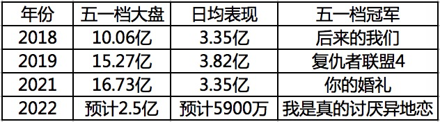 尤其是过去两次五一档更是有着出色的表现。其中2021年的16.73亿打破了五一档总体量的纪录,而2019年则是以单日3.82亿成为日均票房冠军。之所以拥有出色的表现,除了具备了4-5天的长假之外,更多还是跟种子选手的发挥有关。比如2019年的《复仇者联盟4》,比如2021年的《你的婚礼》《悬崖之上》等等。
