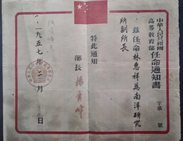 林先生圆了创办一所人类学博物馆的梦。一九五一年,他捐献了大量图书和藏品。一九五三年三月十五日博物馆正式开放。一九五六年,博物馆已具相当规模,拥有三十六个大小陈列室,陈列品包括早期人类复原模型,华北和东南地区的考古文物,南洋、日本、印度古代文物和民族志标本。林惠祥生前未能实现创办人类学系和研究所的理想,然其倡导的南洋研究却得以成长。一九五〇年,他被校长任命为南洋研究馆馆长,一九五七年,又被教育部任命为南洋研究所副所长。该所可谓是我国最早的“区域与国别研究”机构,一九九六年扩大为拥有数十名在职人员的研究院。为了专心筹办人类博物馆,“其志甚坚,其情尤挚”(王亚南语),林惠祥辞去历史学系主任之职,但他继续在东南民族史和考古学研究领域发挥着重要作用。