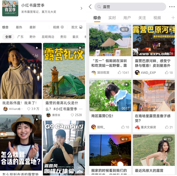 五一期间,小红书专门推出“露营季”激励博主创作,江苏卫视则推出以露营为主的综艺,广州塔下也办起了“星空露营”活动;而在各大社交平台上,露营相关的话题迅速攀升,短视频、营地攻略、必备器具推荐等层出不穷。