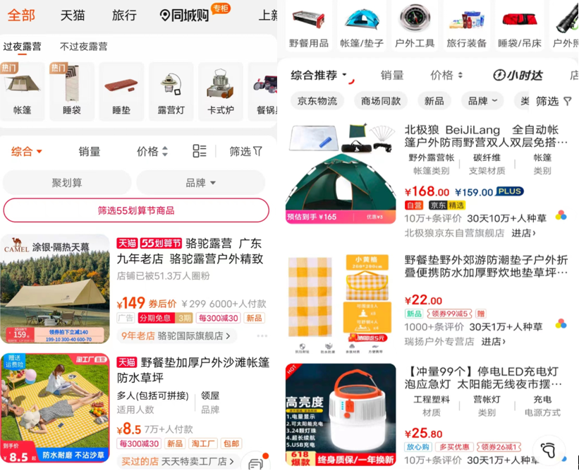 据投资界统计,截至目前,微博上露营相关的超话最多已经超过200万粉丝;在小红书上搜索“露营”出现110多万篇笔记;豆瓣相关话题超过20多万次浏览;知乎上的讨论也突破了2.5万个……露营火爆程度可见一斑。五一前夕,露营用品销量翻倍增长,一场准备充分的露营动辄上千元,一些帐篷等露营用品上万元比比皆是。