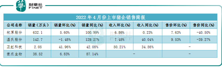 5月5日,牧原股份、温氏股份、正虹科技、傲农生物4家上市猪企集体发布4月份销售简报。从数据披露看,大部分猪企销量、收入及售价环比呈增势。