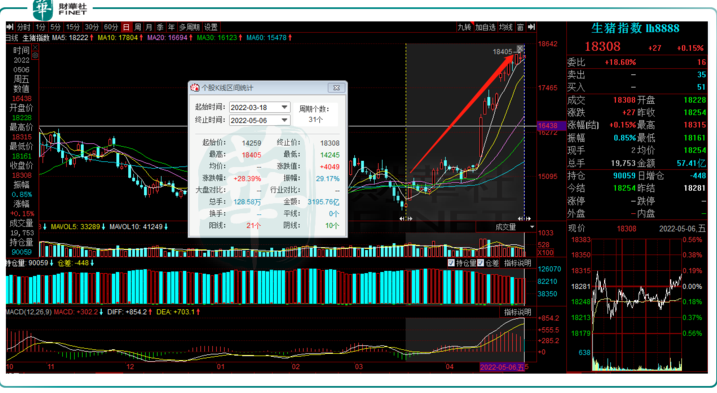 实际上,在现货生猪市场显露复苏迹象之前,期货价格早已有所反弹。行情数据显示,3月中旬迄今,生猪指数已回踩反弹超40%,最新收报18308点,涨势犀利,这也在一定程度上反映了市场对生猪价格回升的预期。