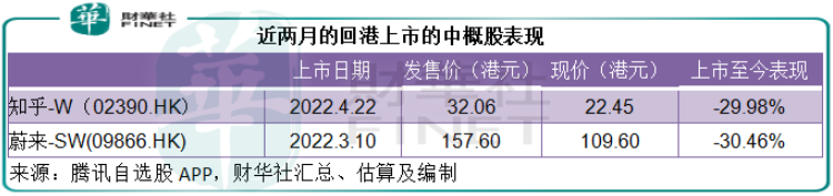近两个月回归的两大中概股在港股表现并不理想,上个月回来主要上市的知乎(02390.HK,ZH.US)现价较其发售价折让29.98%;以介绍形式回港第二上市并且刚刚宣布在新加坡在开辟一个第二上市市场的蔚来-SW(09866.HK,NIO.US),现价较其港股上市前一晚美股收市价折让30.46%。