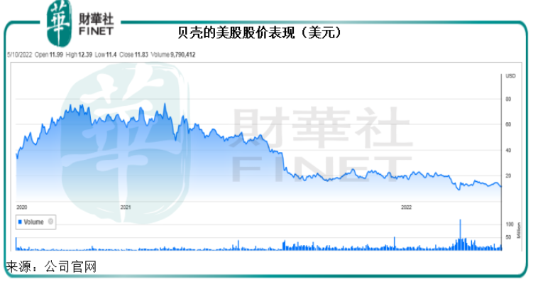 见下图,贝壳上市后,股价一直狂飙,曾一度大涨逾2.85倍,最高或到达76.92美元,随后因为监管和国际资金流向变换而下挫,到2022年5月10日(港股上市前夕),收市价仅11.83美元(ADR换算价或为30.76港元),较其美股公开发售价折让40.85%,较高位回撤逾84.6%。