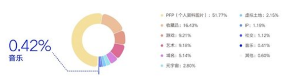 根据TME《2021华语数字音乐年度白皮书》数据显示,2021 年全球NFT交易金额约为250 亿美元(一级市场及二级市场总和),但音乐类NFT交易市场份额只有可怜的0.42%。