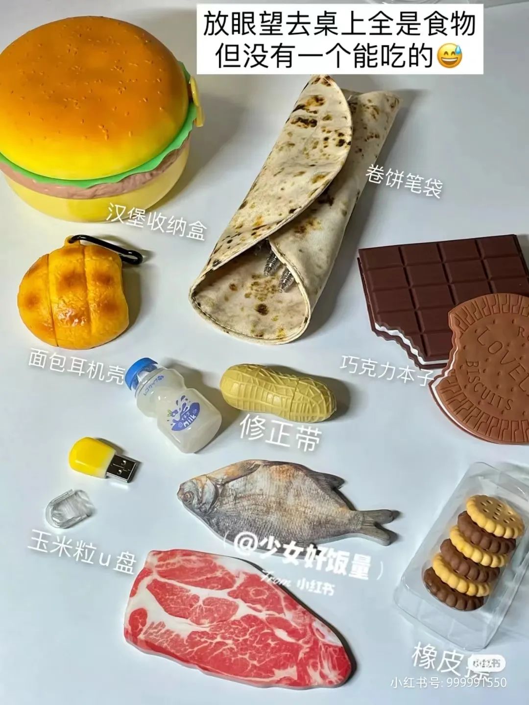 但很难有人不对这些奇怪的文具心动,巧克力本子、卷饼笔袋、五花肉便利贴、花生修正带......差生文具多的俗话,不是没有道理的。
