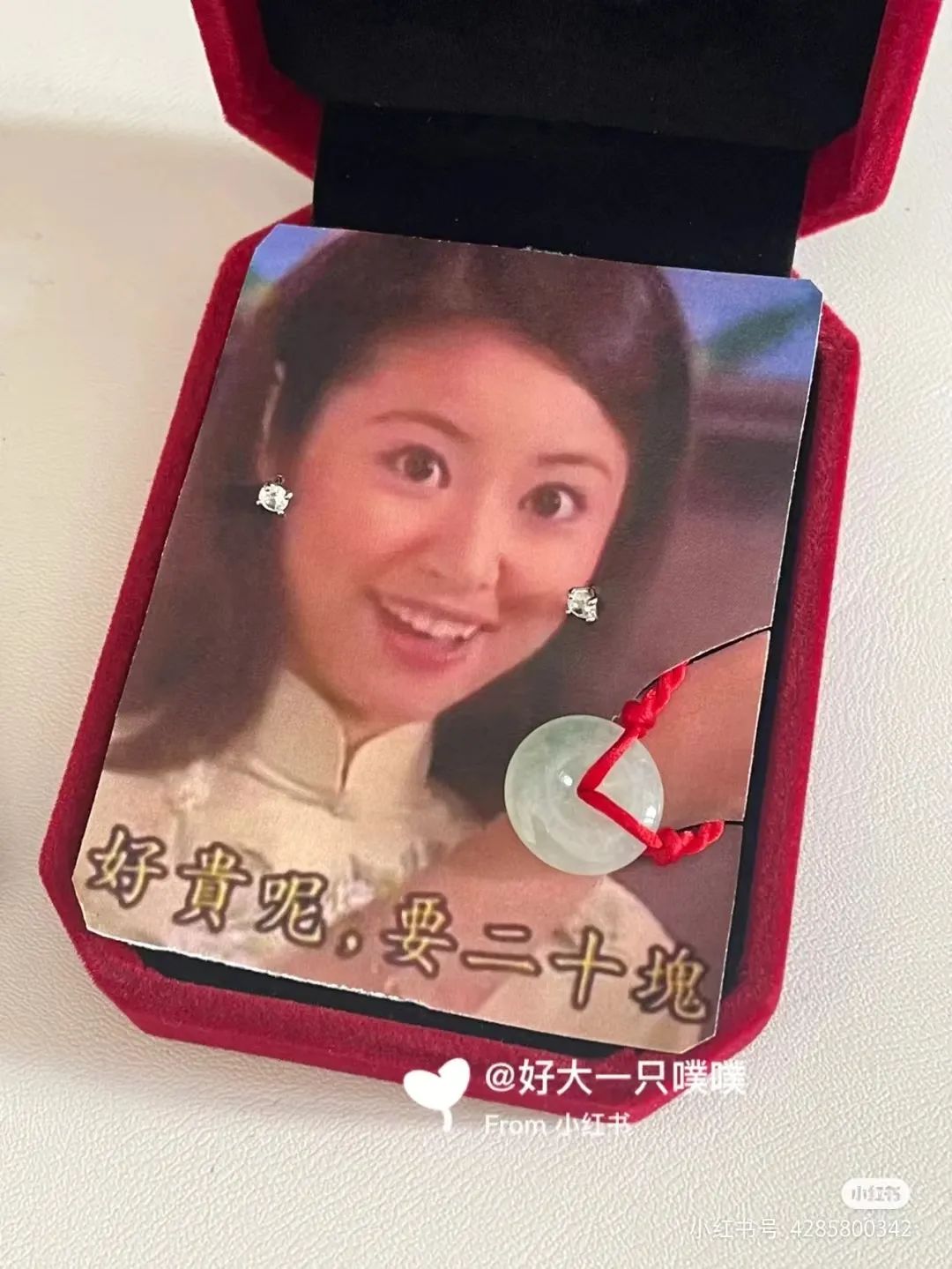 曾登上热搜,被列为送怨种姐妹绝佳礼物的首饰盒,巧妙地利用了时空的不同,将文字与画面结合在一起,体现出一种反讽的小幽默。在《情深深雨蒙蒙》中,如萍满脸开心地说:“好贵呢,要二十块”合情合理,而这句台词搬到现在的语境,指向首饰这类奢侈品,反差的喜感马上就浮现出来了。
