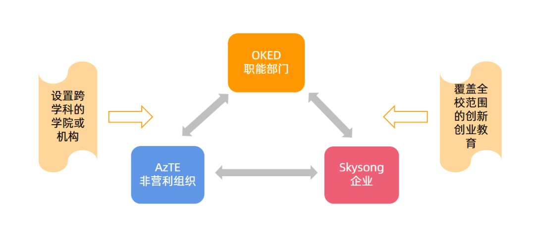 知识发展办公室(OKED)是职能部门,主要是起“领导作用”,统筹管理成果转化;亚利桑那州立大学斯科茨代尔创新中心(Skysong)是学校出资成立的科技服务型企业,主要负责孵化创新创业项目;亚利桑那科技公司(AzTE)作为学校支持且与学校紧密合作的非营利组织,主要承担成果推介和信息搜集的任务。