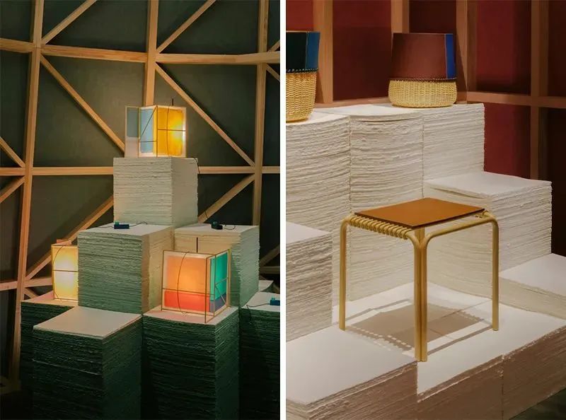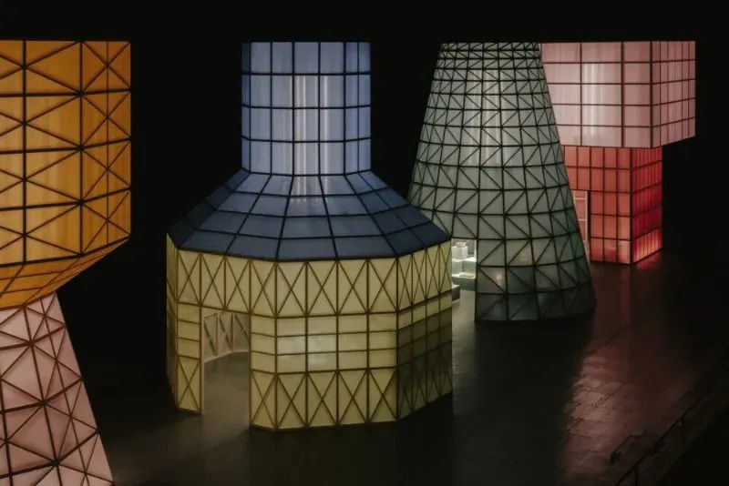 今年爱马仕在展馆内打造了4个巨型装置,它们体积庞大,如水塔一般,但纤细的框架、半透明彩纸和内部光线的共同作用,又呈现出了轻盈的视觉外观。