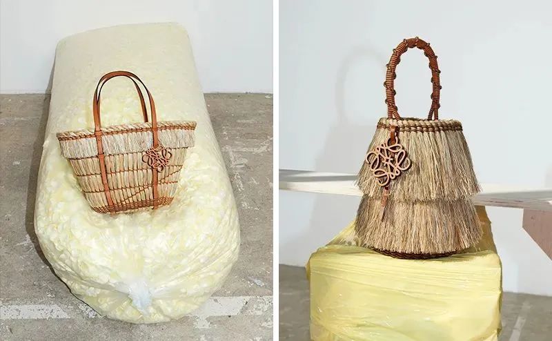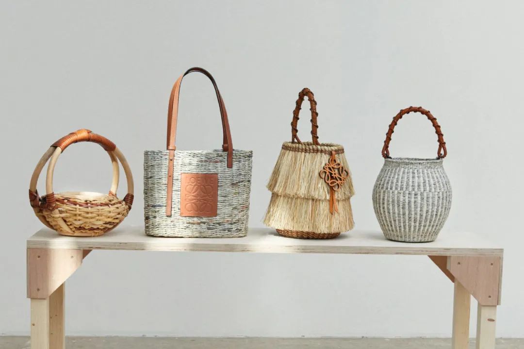 另外还有以西班牙加利西亚地区古老工艺「稻织 Coroza」打造的一系列产品。「稻织 Coroza」是当地用稻草、芦苇、石楠等天然纤维制作雨衣、帽子和篮子的一种工艺,Loewe将这一工艺标志性的流苏元素运用到了织袋和编篮的设计中。