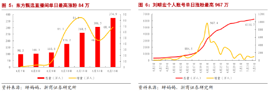 截至 6 月 13 日,东方甄选直播间的粉丝数量为 374.9 万,较 6 月7 日涨粉 276 万,一周涨粉近 3.7倍,与刘畊宏直播间粉丝曲线高度相似。