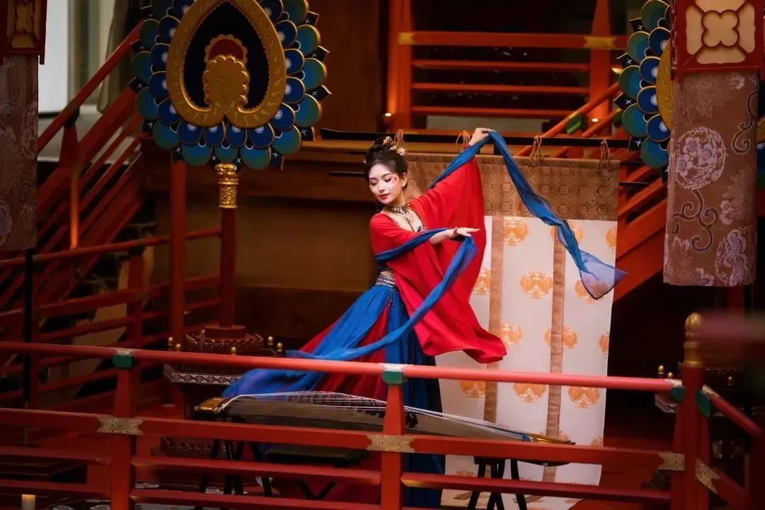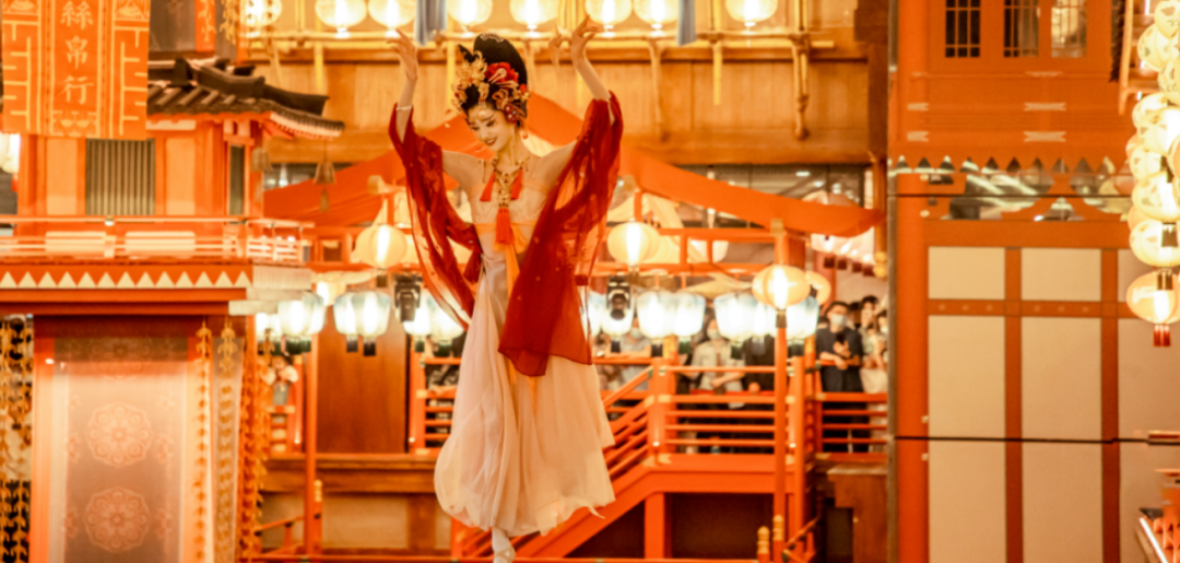 特别设置的三层舞台区域,将唐代“霓裳羽衣曲”复刻呈现,真人互动式演艺的场景,让消费者能够身临其境体验大唐繁华。
