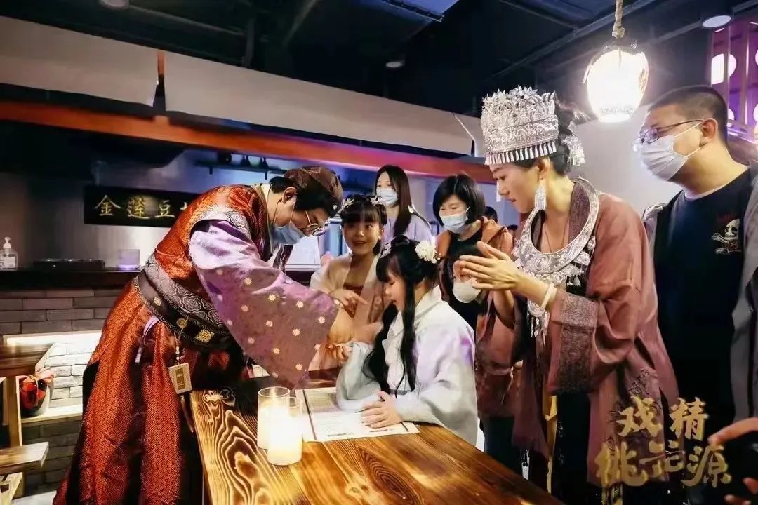 而且,戏精桃花源还将沉浸式场景、剧情演员、故事游戏、入驻店铺,通过游戏串联起来,消费者可以在真人NPC的互动和帮助下完成任务,在游逛的同时还完成了游戏体验。
