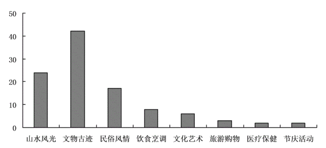 虽然难以获得严谨的研究数据,但从有限样本的调研情况来看,海外游客来华旅游的第一动机,是出于对中华文明传统文化的好奇和喜爱。据《日本游客来华旅游的文化动机及开拓其巿场的对策》文中统计,日本全体游客旅游项目选择偏好中,超过40%选择了文物古迹类别。