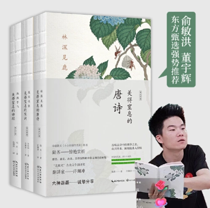另一方面,他们还充分利用董宇辉原新东方老师的身份,以他的教学经验与视角选择一些青少年读物,尤其是涉及双语的书籍,比如《美得窒息的唐诗/宋词/诗经》这套诗集,更进一步巧妙地加深人们对新东方品牌的印象。