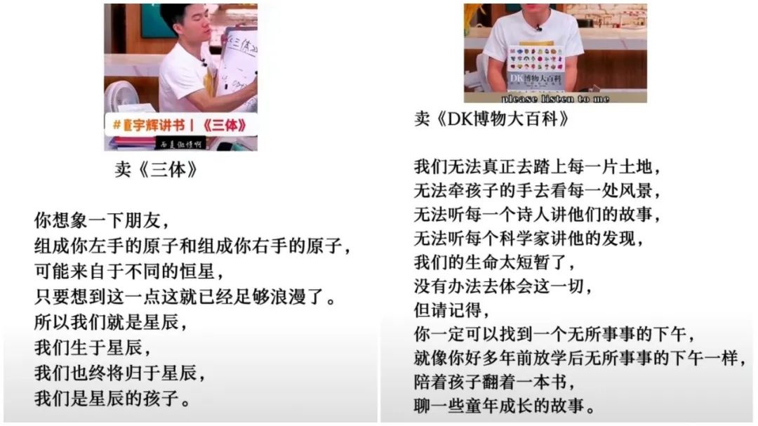 另外,在直播间,董宇辉一直以一个“爱书者”的身份进行推介,而非冷冰冰的售书员。在同是爱书人的心理下,让网友观看他的书籍直播推介更像是朋友之间分享喜爱事物,距离感更弱,亲近感更强,网友在直播卖书过程中也更易被共情和代入。当然,这也与他常年教书积累的经验有关。