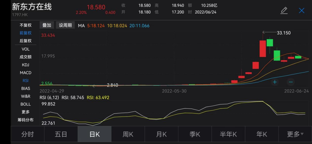 不过,从6月17日开盘,新东方在线股价开始下跌。20日-24日的一周内,新东方在线累计跌幅达到35.03%,截至24日收盘,报18.58港元/股,总市值约185.9亿港元。