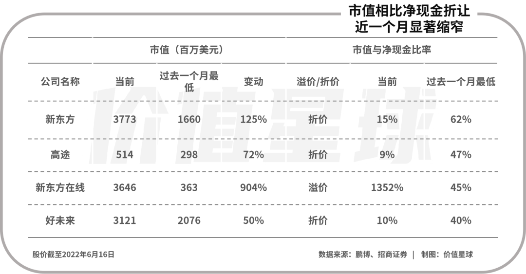 按招商证券国际的统计,5月中旬至6月中旬,教育龙头新东方及好未来的市值相比最近一期报告净现金水平的折让为62%及40%,而现在已经缩窄到15%和10%。