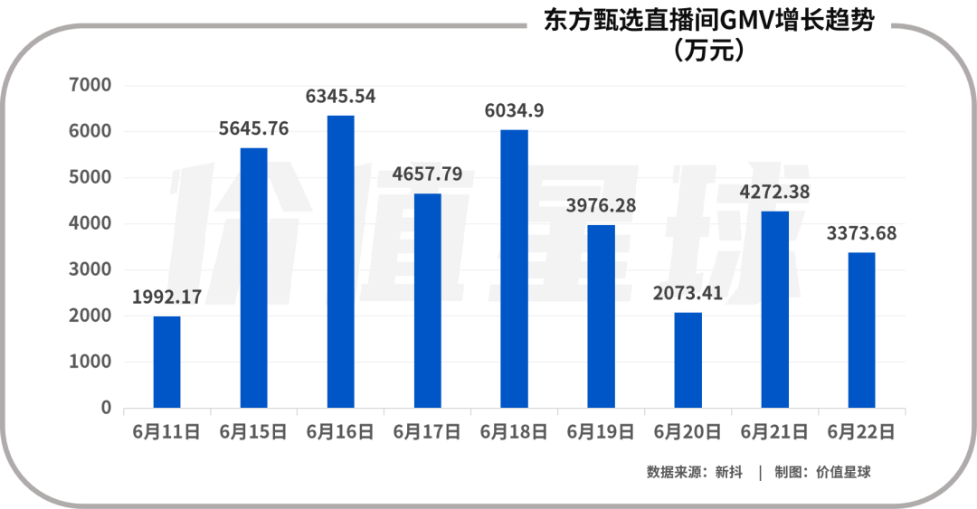 然而自6月以来,东方甄选的双语直播受到网友广泛关注,直播间人气有所上升。公开信息显示,从6月10日开始,东方甄选粉丝、直播间在线人数以及GMV(商品销售总额)均出现爆发式增长,抖音账号粉丝从不到100万快速增长至6月21日的1770万。其直播间单日GMV快速提升到千万级别,6月16日其直播间单日GMV甚至超过6300万元。