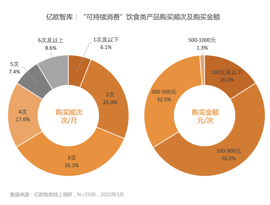研究数据显示,在我国青年群体中,“可持续消费”饮食行为的综合渗透率高达93.2%,其中产品传达的可持续理念,希望践行可持续的生活方式对可持续饮食消费的促进作用明显,分别有43.1%和39.3%的消费者因此践行。在消费频率和消费金额上,青年消费者月均购买集中在2-4次, 每次花费集中在100-300元。