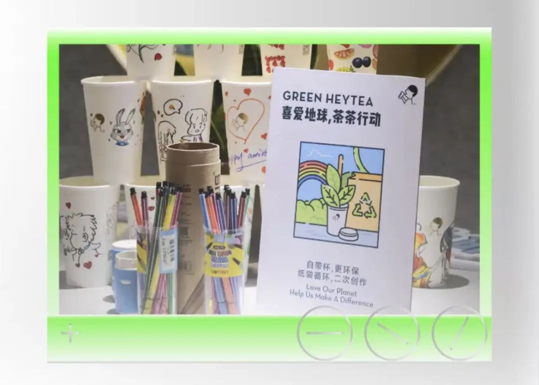 在新茶饮领域,喜茶巧妙的将环保与年轻人喜闻乐见的展览搭配在了一起。于2020年6月份和11月份分别举行了“绿色喜茶”再回收及线下门店展示活动,就是喜茶对这一理念的运用。通过回收门店的纸杯、杯套、纸袋、吸管等,并融入茶渣果皮天然色彩,制成环保产品或艺术陈列设置的方式,喜茶在“再生”的概念下诠释其环保美学。官方数据显示,截至6月份,喜茶已经回收了超1800公斤饮品杯子,所制成的环保产品在10月份进行了线下门店展示。