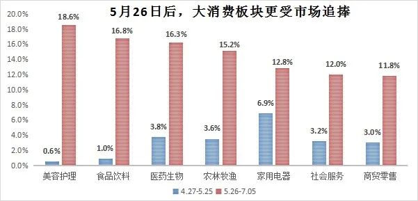 5月27日-7月5日,前期快速反弹的板块依旧给力,美容护理、食品饮料、医药生物、农林牧渔、家用电器等大消费板块也快速崛起,涨幅不遑多让。这一阶段申万一级行业涨幅前5名中,3个属于大消费板块,如果计入汽车板块,就有4个。
