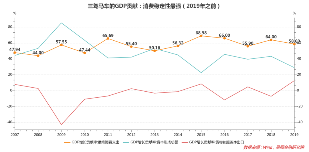 消费一直被视作国民经济增长的压舱石,一则权重占比高,2021年为65.4%,二则稳定性强,波动有限。从消费、投资、净出口三驾马车的GDP增长贡献率来看,净出口贡献或正或负(同比负增长便是负贡献),投资贡献大起大落,波动区间都较大,只有消费在窄幅区间内波动,成为名副其实的压舱石。2014-2019年,消费的贡献占比约在56%-69%之间。