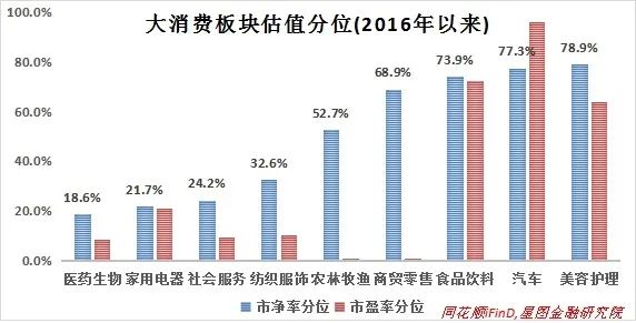 具体到A股来看,汽车板块受新能源车带动、食品饮料板块受高端白酒带动、美容护理板块受医美概念带动、商贸零售板块受免税概念带动等,均在疫情影响中走出了独立行情,估值分位处于历史较高位置;而医药生物板块受制于医保控费逻辑、家用电器受制于地产下行周期、社会服务板块受制于旅游餐饮不振、纺织服装板块受制于消费升级受阻等,估值分位处于历史较低位置;农林牧渔板块主要受猪周期影响,一直都是独立逻辑。