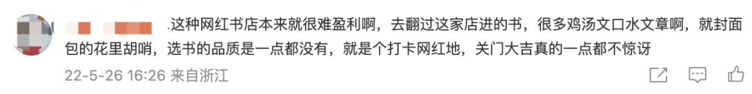 “这种网红书店本来就很难盈利啊,去翻过这家店进的书,很多鸡汤文口水文章啊,就封面包的花里胡哨,选书的品质是一点都没有,就是个打卡网红地,关门大吉真的一点都不惊讶。”一位网友在微博上留言道。