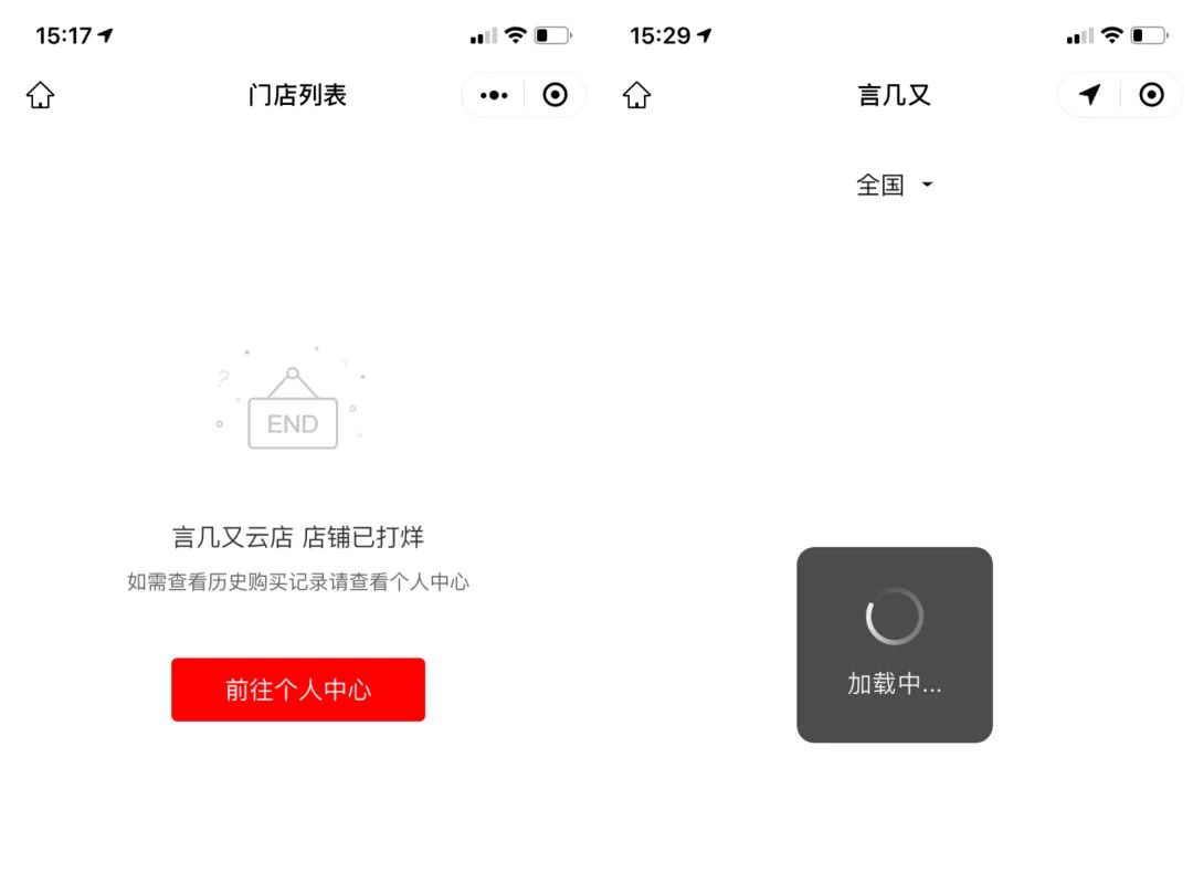 截至目前,言几又官方微信门店地址查询始终处于“加载”状态。