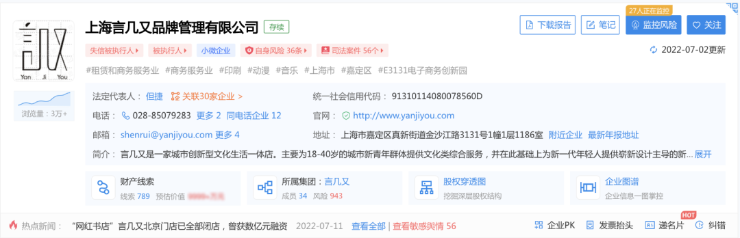 另据公开的法律文书显示,江苏言几又文化传播有限公司与上海言几又品牌管理有限公司涉及多个案件。有执行裁定书显示,法院未查到上述两公司有可供执行的财产,案件结果为终结该执行程序。