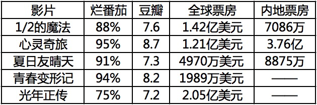 后面的《夏日友晴天》继续在透支皮克斯的信誉,烂番茄91%这个遮羞布完全不堪一击,在市场层面并未给予好评。影片延续了皮克斯的脑洞和创意,奈何故事层面总是落于俗套,市场表现亦是低迷。虽然国内成功引进,但最终未能突破1亿大关。