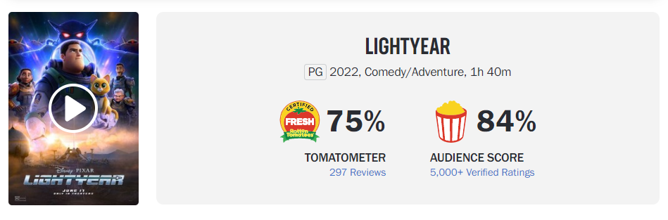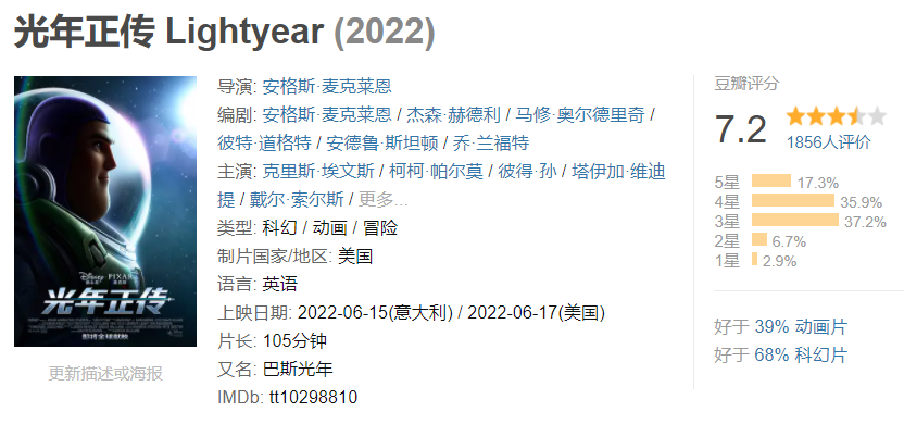 同性的话题并不是杀死《光年正传》的全部,更多还得归结于内容端创作的坚实程度,这也是皮克斯近年来屡屡犯错的地方。目前北美烂番茄仅有区区75%,成为皮克斯近年来的新低,国内口碑方面,豆瓣仅有区区7.2分,同样也是低迷的数据。75%、7.2,这种梦工厂、照明级别的分数,不该出自皮克斯。