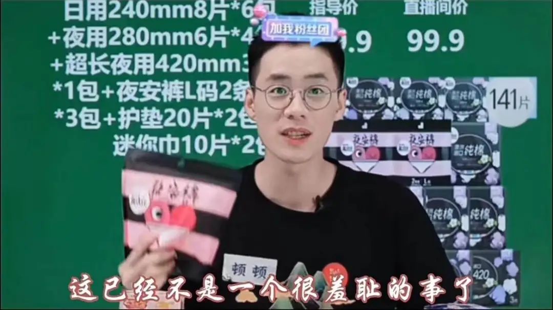 粉丝瓦瓦告诉开菠萝财经,自己印象最深刻的顿顿直播片段,就是最近社交平台上被大家津津乐道的“顿顿在‘美丽生活’卖卫生巾”。“虽然是女性用品,但他在介绍时落落大方、态度端正,没有丝毫扭捏,一直教育大家不必有月经羞耻,这是很正常的事情,男生女生都要注意卫生。”