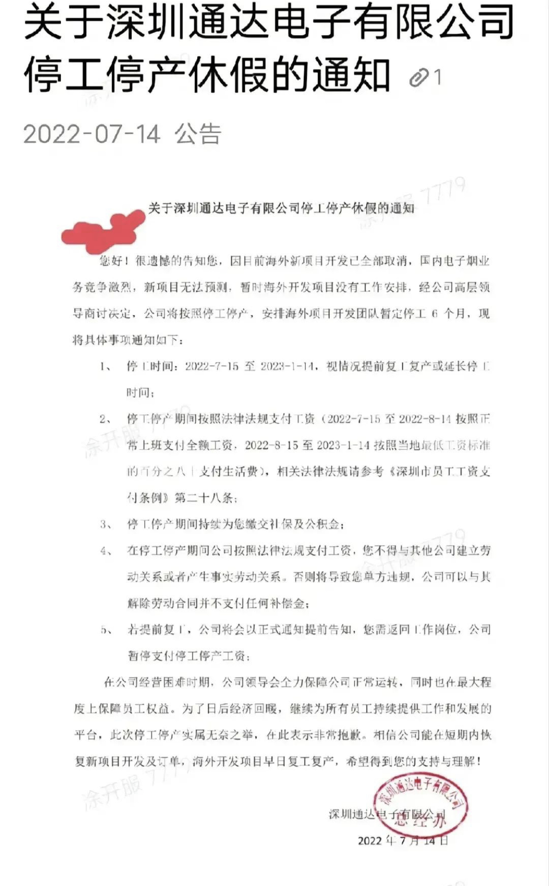 最近,一张关于深圳通达电子有限公司(以下简称“深圳通达”)停工停产休假的通知在网上流传。