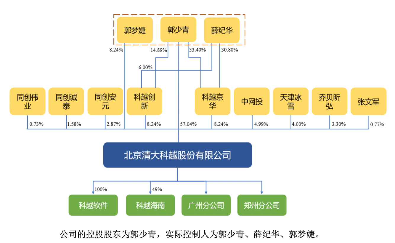 IPO前,清大科越的控股股东为郭少青,实际控制人为郭少青、薛纪华和郭梦婕,其中,郭少青与薛纪华为夫妻,郭少青与郭梦婕为父女,三人可支配表决权的股份比例合计为81.76%。