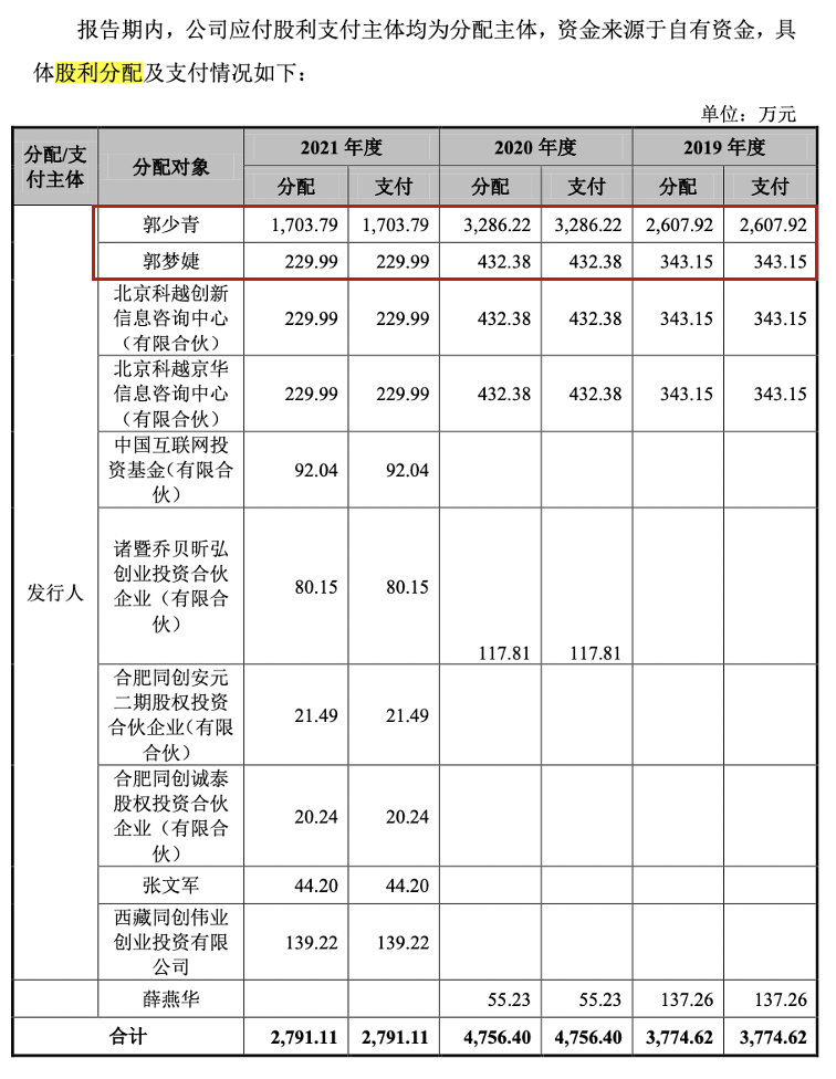 界面新闻记者注意到,报告期内清大科越现金分红分别为3774.62万元、4756.40万元、2791.11万元,合计1.3亿元;而同期净利润分别为2787.7万元、5967.33万元、8035.69万元,合计1.68亿元,近三年77.38%的净利润用于分红,而分配对象也主要是郭氏父女。截至2021年末,公司未分配利润为0.53亿元。