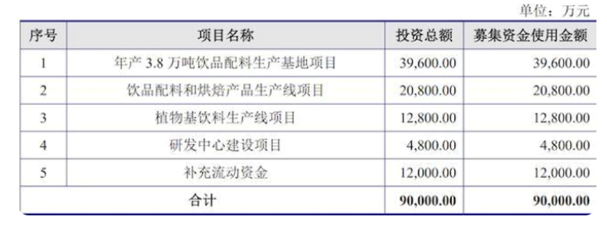 本次预计发行不超过1682.3万股股票,募集9亿元。募集资金将用于年产3.8万吨饮品配料生产基地项目、饮品配料和烘焙产品生产线项目和植物基饮料生产线项目等。