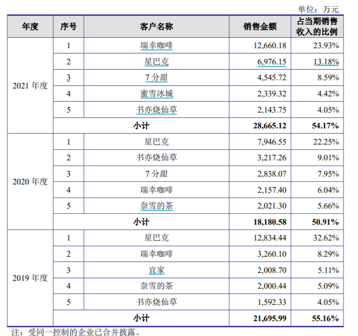 招股书显示,德馨食品已发展成为诸多食品饮料连锁品牌的供应商,包括百胜中国(YUMC.N)、麦当劳、星巴克(SBUX.O)、7分甜、蜜雪冰城、瑞幸咖啡(LKNCY.OO)、奈雪的茶(2105.HK)、书亦烧仙草、呷哺呷哺(0520.HK)、宜家、华莱士、阿华田、乐乐茶、海底捞(6862.HK)、永和大王和三只松鼠(300783.SZ)等。