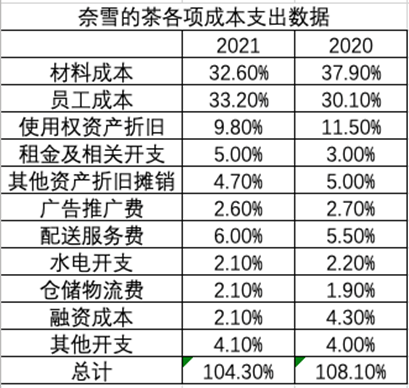 据2020年及2021年财报,奈雪的茶各项成本和费用合计,占营收比已超过100%。奈雪的茶距离总体盈利,还有相当大的距离。