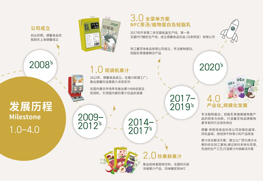 2012年,德馨食品的前身——德馨有限成立,并首次推出自己研发的BIB果汁和饮料现调机。2014年之后,德馨食品开发出固体饮料、无菌利乐装浓缩果汁产品、风味糖浆和NFC茶汤等产品品类。