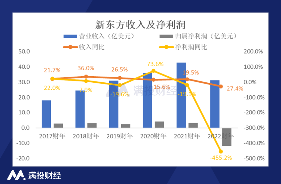 根据财报,新东方在2022财年第四季度实现收入5.24亿美元,同比下降56.8%;归属净亏损为1.89亿美元,亏损同比扩大316.36%。2022财年年度净收入为31.05亿美元,较上一财年同比减少了27.4%,归属净亏损为11.89亿美元。收入下降以及亏损扩大的原因,主要是“双减”政策下,新东方核心业务进行了重组,停止了K9学术课后辅导服务业务。