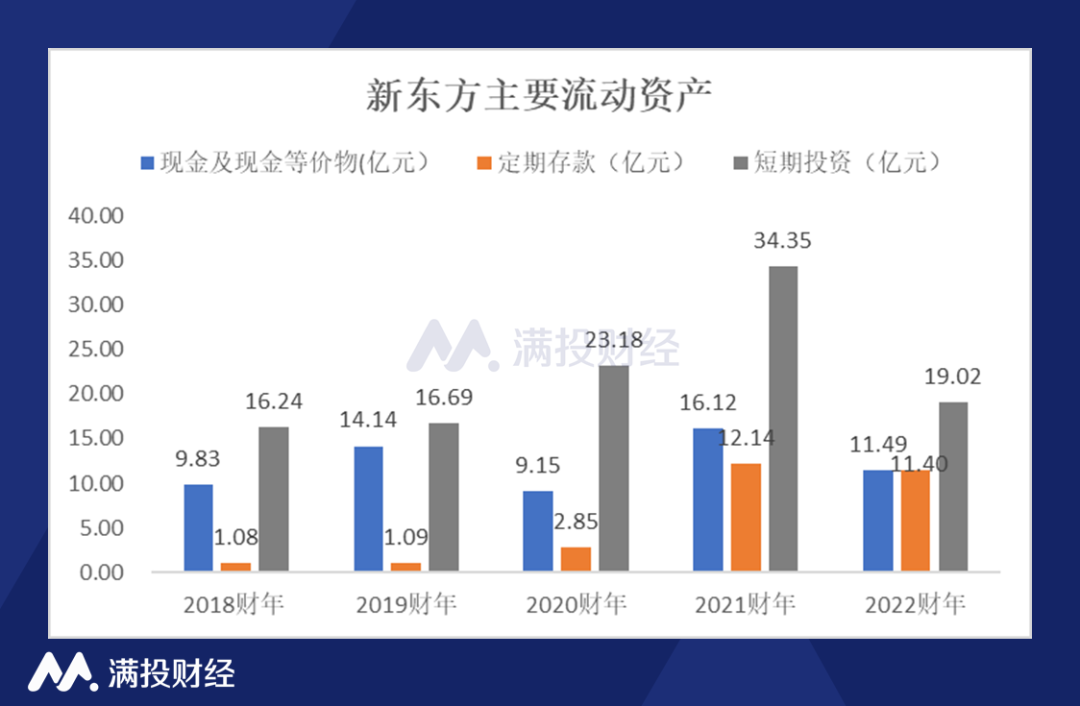 值得注意的是,虽然“双减”政策给新东方造成了巨大的打击,但是公司在业务重组的过程中仍保持着较为强劲的现金状况。2022财年,新东方的主要流动资产约为42亿美元,其中现金及现金等价物11.49亿美元、定期存款11.40亿美元、短期投资19.02亿美元;总体家2021财年有所下降,但仍保持较为充裕的状态。