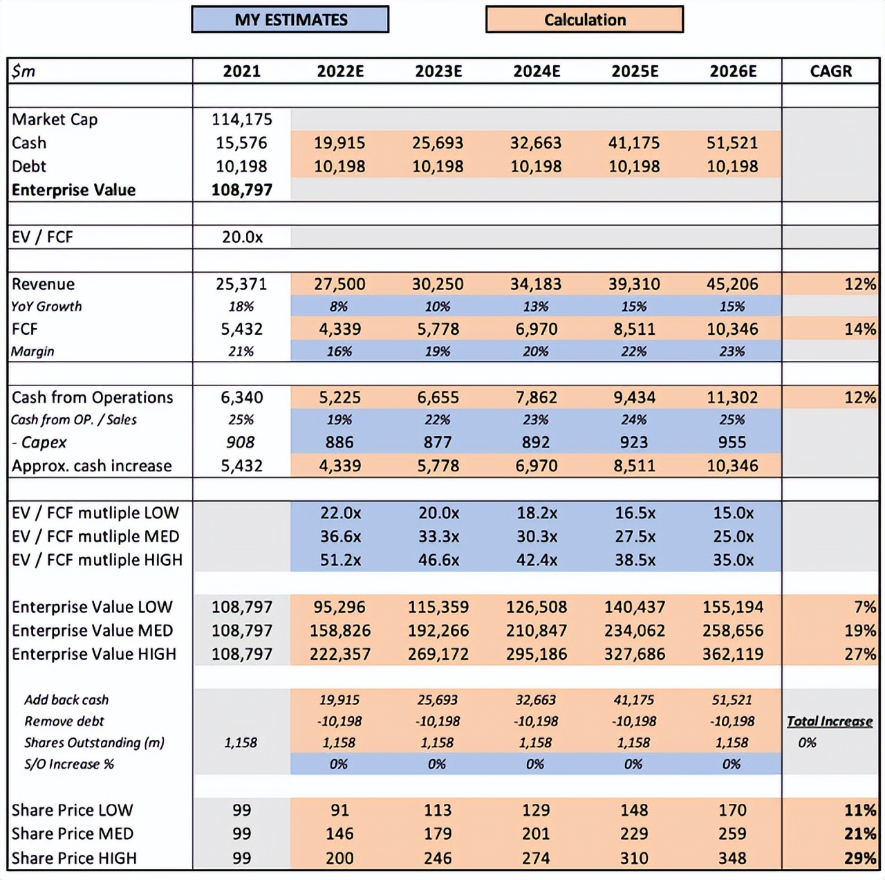 与此同时,相信 PayPal 将继续扩大利润率,特别是在激进投资者的“鼓励”下,这将在 2023 年开始生效。我还使用了我认为合适的 2026 年 EV / FCF 倍数鉴于 PayPal 的规模和增长前景。